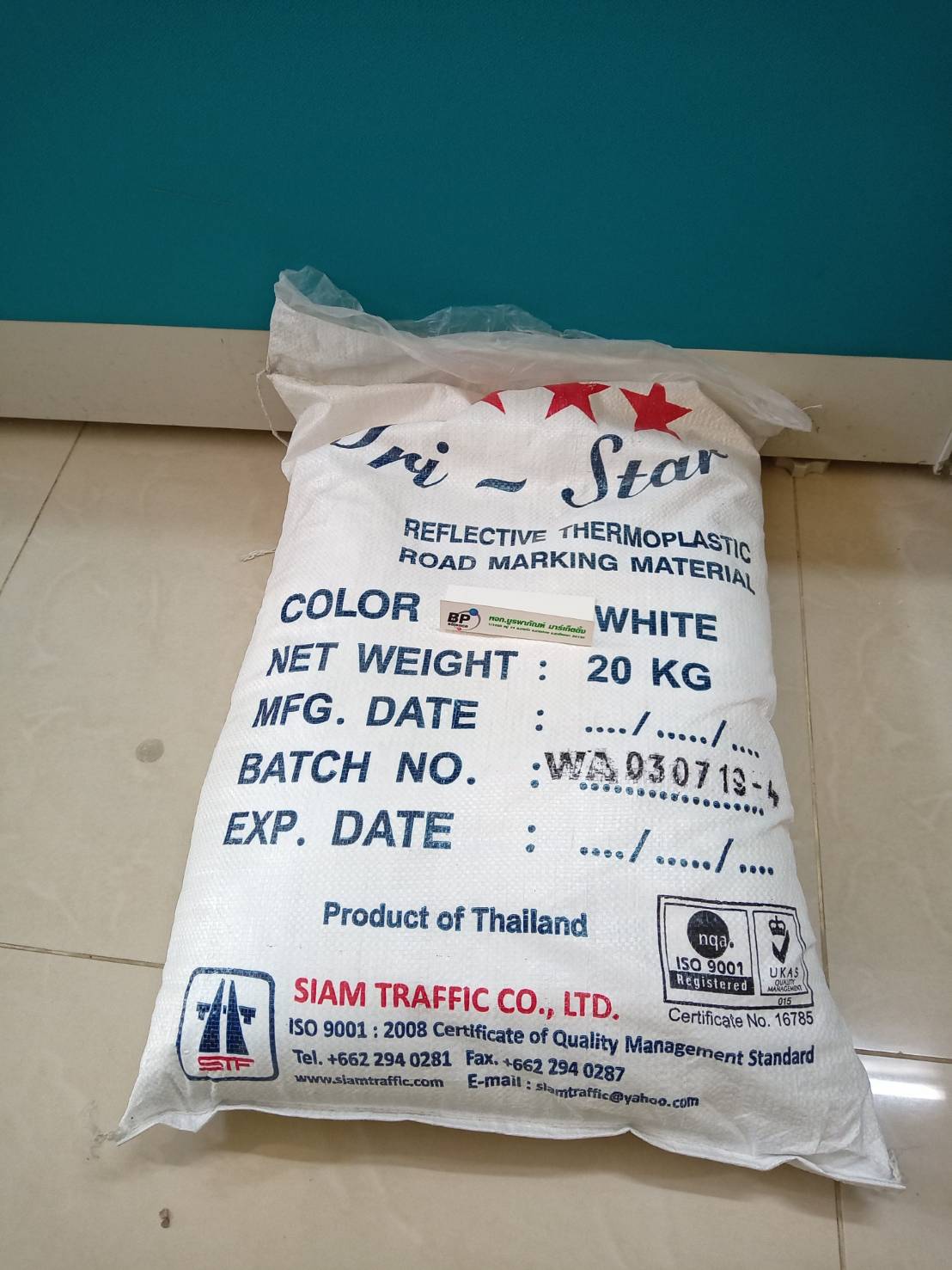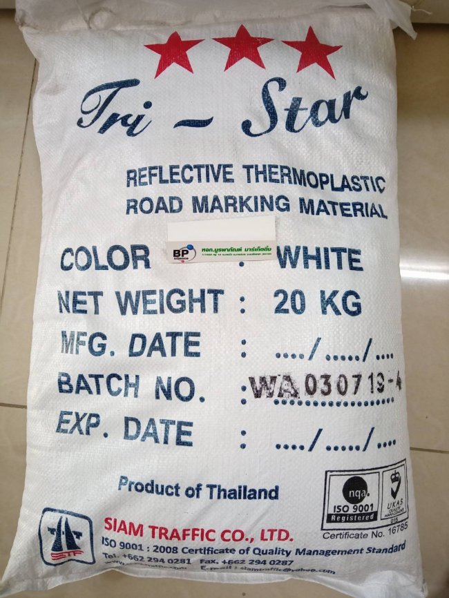 สีเทอร์โมพลาสติก ตีเส้น สีตีเส้นจราจร สีตีเส้น สีตีเส้นถนน ตีเส้นจราจร รหัส : 25 ราคา : 0 .- ประเภท : สีทาถนน/งานจราจร สีเทอร์โมพลาสติก ตีเส้น สีตีเส้นจราจร สีตีเส้น สีตีเส้นถนน ตีเส้นจราจรสีเทอร์โมพลาสติก ใช้สำหรับทำเครื่องหมายบนผิวทางของบริษัท สยามทราฟฟิค จำกัด ภายใต้ชื่อผลิตภัณฑ์ “ไตร-สตาร์” (Tri-Star) ซึ่งผลิตตามมาตรฐานกรมทางหลวง ได้รับมาตรฐานอุตสาหกรรม มอก. 542-2549 และยังได้รับการรับรองมาตรฐานคุณภาพ ISO 9002 ตั้งแต่ปีพ.ศ. 2546