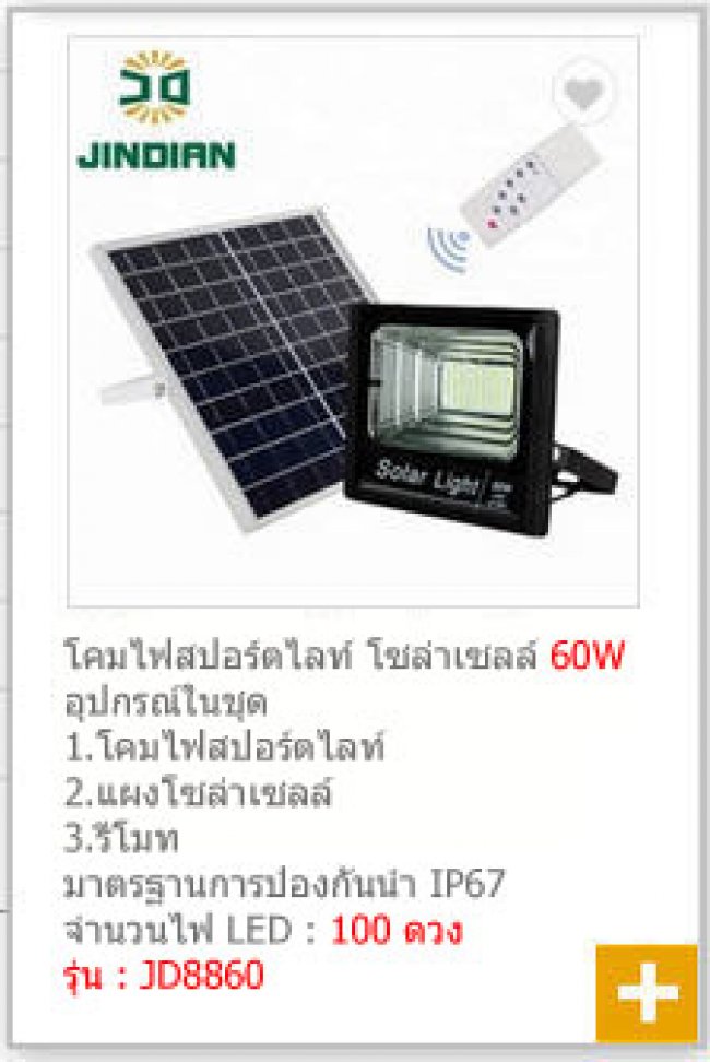 ไฟโซล่า 60 วัตต์ รุ่น F60 มีสีขาว/สีส้มวอร์มไวท์ รหัส : 7 ราคา : 1,900 บ. 2ชิ้น 1,800 บ. .- ประเภท : ไฟโซล่า 60 วัตต์ ไฟโซล่า 60 วัตต์ มี2สี สีขาว/สีส้ม วอร์มไวท์
