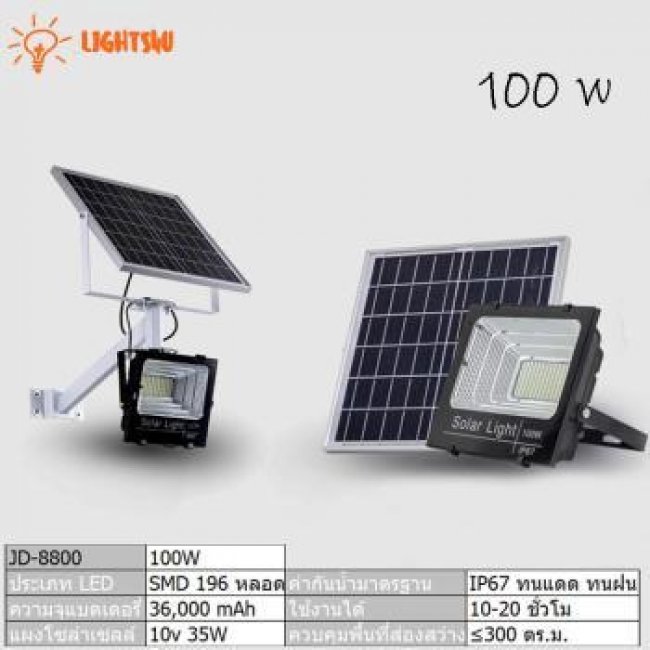 ไฟโซล่า 100 วัตต์ รุ่น F100 มีสีขาว/สีส้มวอร์มไวท์ รหัส : 8 ราคา : 2,150 .- ประเภท : ไฟโซล่า 100 วัตต์ 100W - จำนวน LED : 196 SMD LED - ความจุแบตเตอรี่ : 36,000 mAh - ให้ความสว่าง 9,500 ลูเมนส์ - กำลังไฟฟ้า 100W